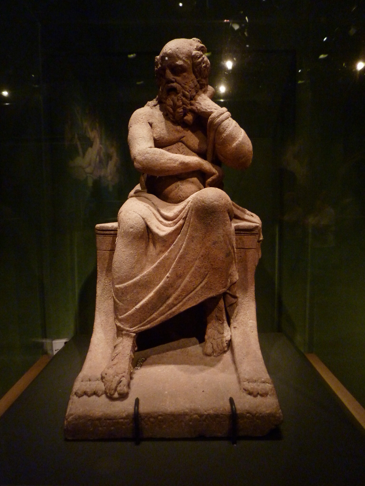 House of Julia Felix, Pompeii. Pittacus of Mytilene, one of the seven wise men of ancient Greece, is captured in this portrait of an elderly man. In his left hand he holds a scroll indicating his scholarship. This is one of a set of sculptures on intellectual themes found in the garden.