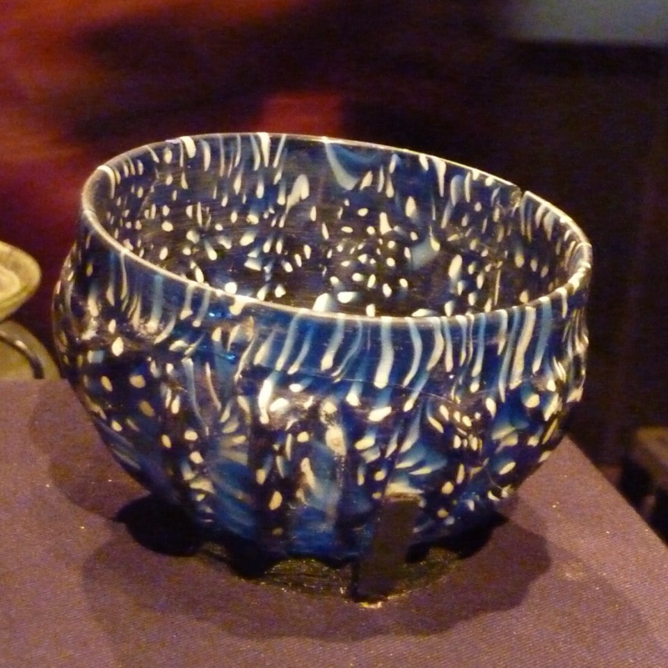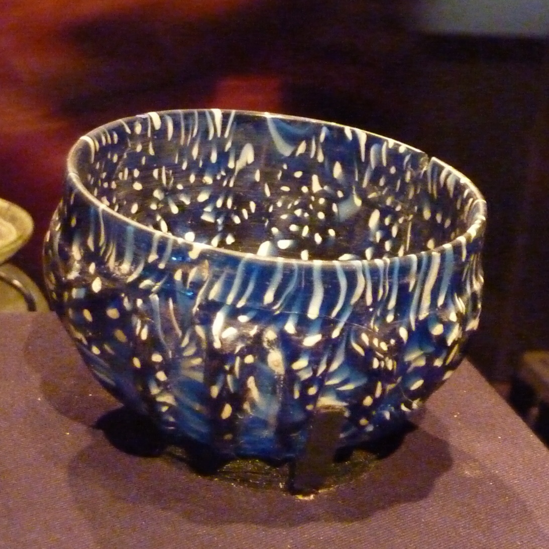 Typical of tableware created in the workshops of the Po Valley in the north of Italy, this glass cup is made of mottled blue glass flecked with white. Its rounded edge sits atop a hemispherical bowl with vertical ribs.
