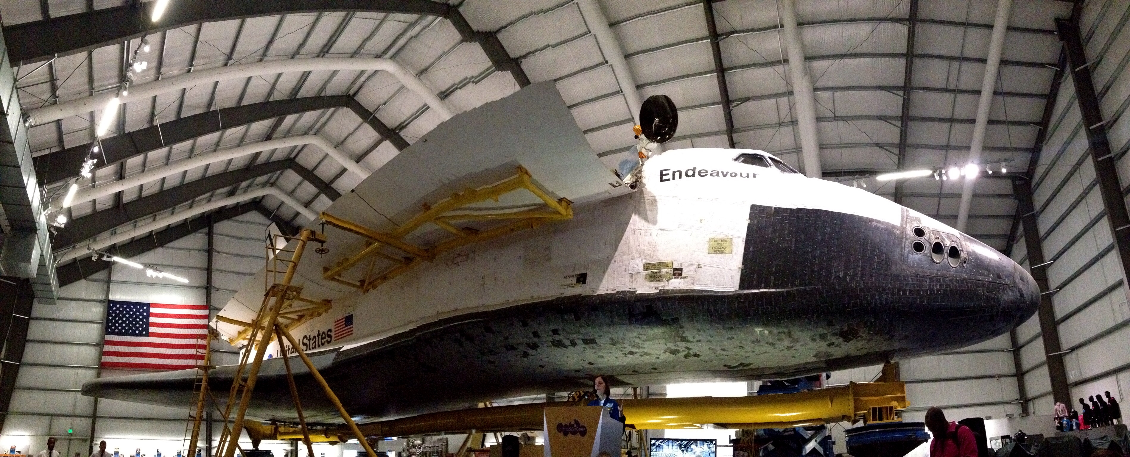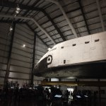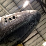 Fun fact from the website: “Guests who come to see Endeavour often notice that the flag on the starboard side of the orbiter appears to be “backwards.” But tradition (and an interpretation of the U.S. Flag Code) suggests that the blue field on the flag should always be pointed forward, into the wind, as if the flag were flying on a flagpole in the breeze. The flag is painted the same way on many aircraft, such as Air Force One.”