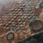 This Gemini 11 space capsule flown by Pete Conrad and Dick Gordon was in space September 12-15, 1966. It landed on autopilot to test the landing system. The pattern on the heat shield is from reentry when the outer surface vaporized from a solid to a gas. It isn’t centered because the capsule came in at an angle.