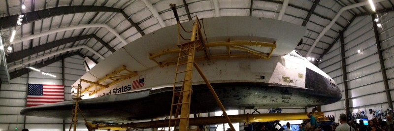 No really, I’m sitting underneath the Space Shuttle Atlantis right now. Freaking out a little.